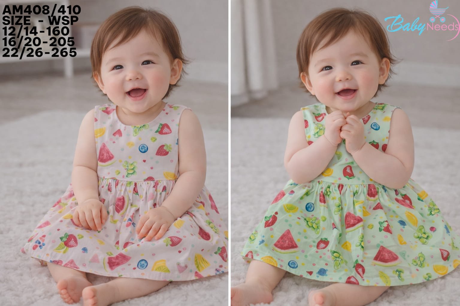 Adorable sleeveless baby girl frock made from soft and breathable cotton fabric, perfect for everyday comfort. Featuring a charming colorful fruit print design, this dress gives a fresh and playful look. The gathered waist adds extra cuteness and allows easy movement for your little one.