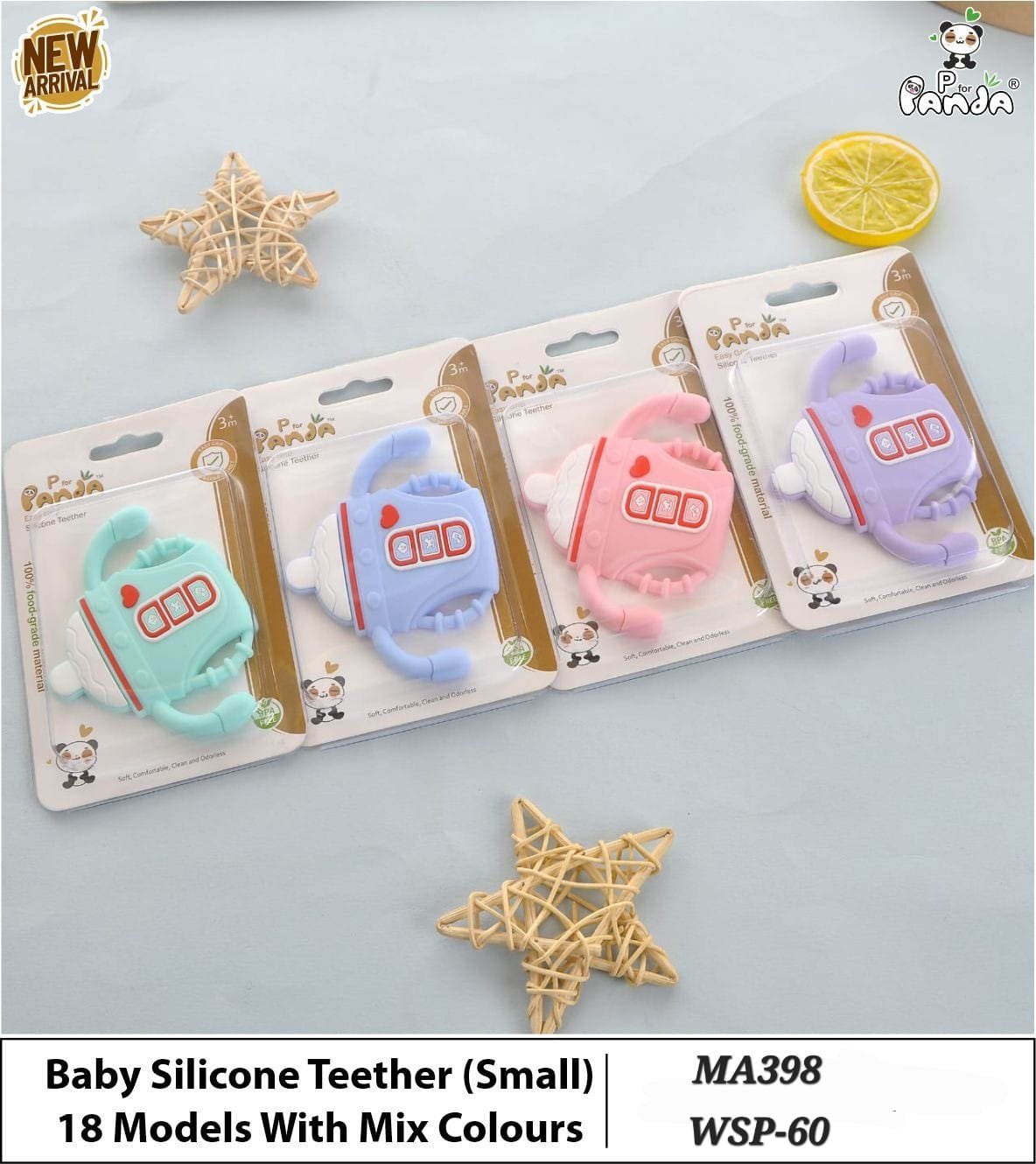 - Cute cartoon shapes make teething fun