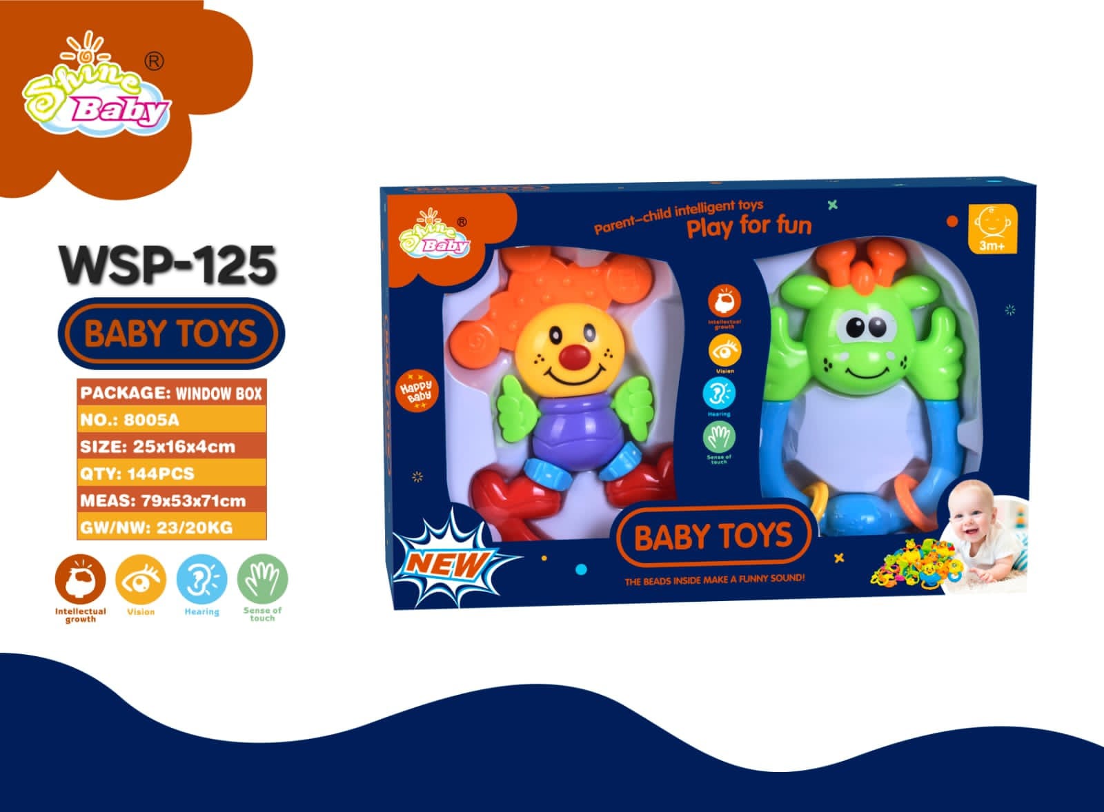 Introduce your little ones to fun and learning with this Shine Baby Intelligent Toy Set, featuring 2 colorful toys designed for children 3 months and older. The set includes a bright orange smiling figure and a green giraffe-shaped rattle that encourages sensory development, hearing, vision, and motor skills. Packaged in a window box measuring 25x16x4 cm, it is perfect for gifting or retail display. Ideal for daycare centers, baby stores, and wholesale buyers seeking engaging and educational baby toys.